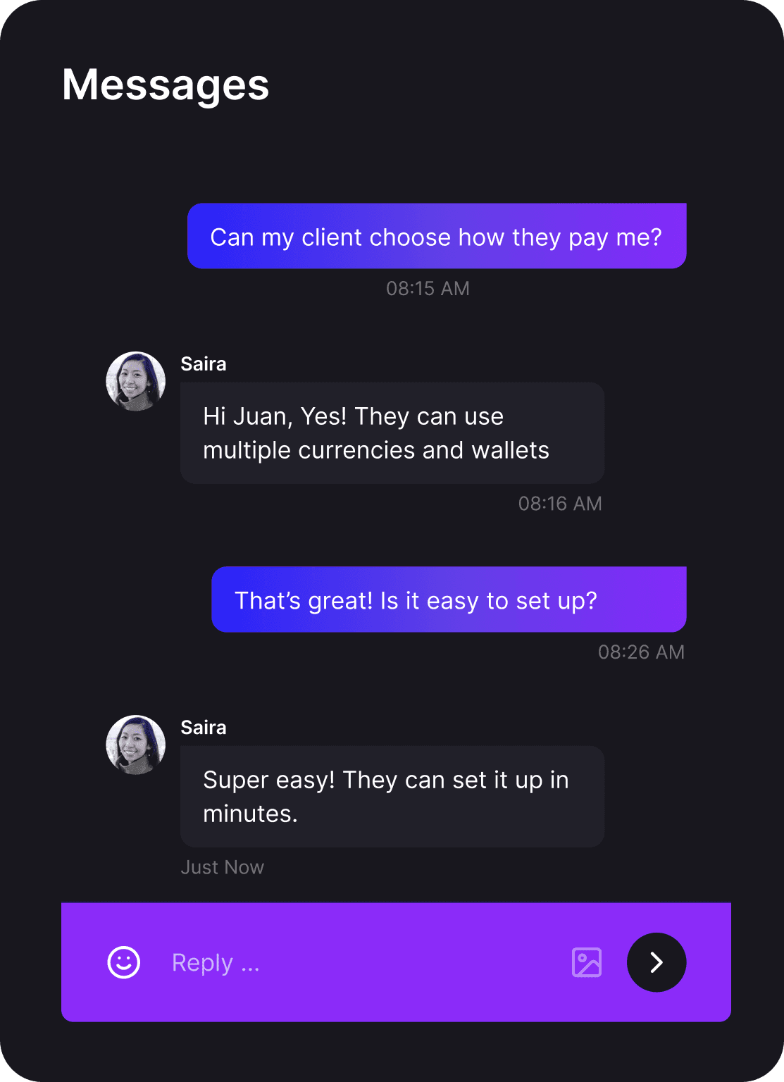 Receive cross-border payments in local currency, stablecoins, or Bitcoin. No delays or excessive foreign exchange fees.