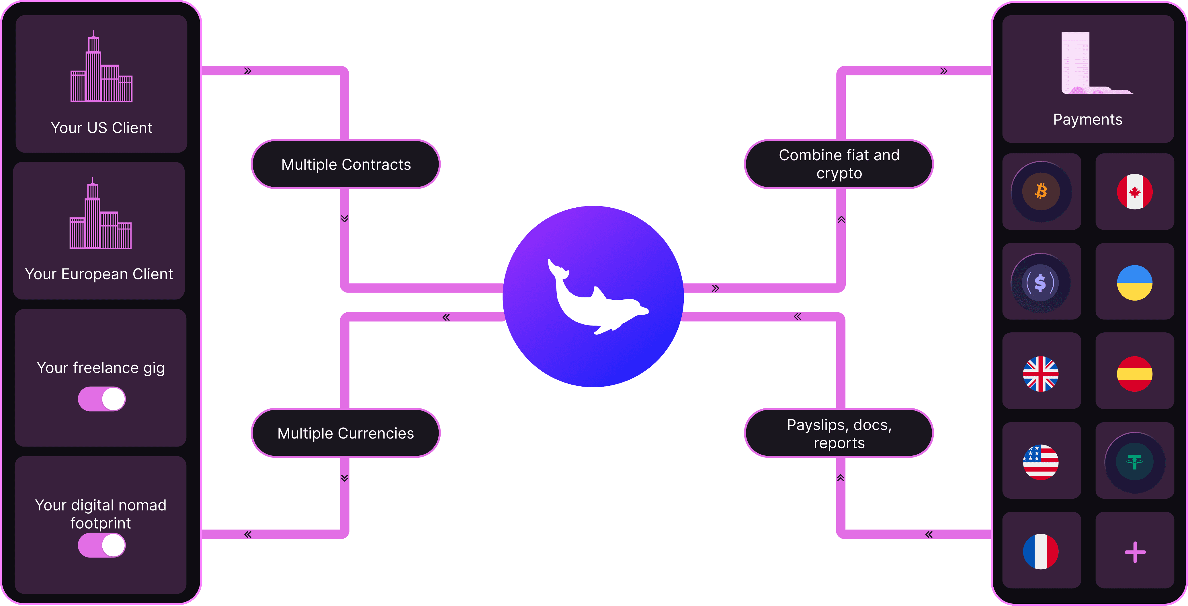 Whether you work with US clients, European startups, DAOs, or global marketplaces. dolphinze simplifies international contractor payroll and multi-currency payouts.